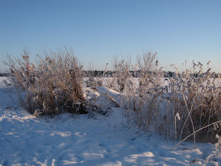 ennen pitkälle lenkille lähtöä. Vaikka monoa poltteli jo heti aamusta, niin upea auringonpaiste taas oli ettei olis malttanu yhtään ylimäärästä sisällä olla. Puolenpäivän aikaan auton mittari näytti "enää" -20 ja kun oltiin Petpostissa käyty palauttamassa Artulla lainassa ollut haukkupanta ja hakemassa possunkorvia ja -saparoita viikonlopun herkuiksi, johan hyvin tarkeni lähteä jäälle häikäisevässä auringonpaisteessa vitivalkoista hankea tallustamaan. Taisi pakkanen pitää ihmiset sisätiloissa kun meidän lisäksi vain pari ulkoilijaa oli uskaltautunut aurinkoon. Tästä ei olis voinu keli parantua, eikä maisemat kaunistua. Ja kun melkein ainuita kulkijoita oltiin, rauhallista ja hiljaista oli. Vain snautserin innostunut haukku silloin tällöin ja kenkien narina lumella rikkoi hiljaisuuden.